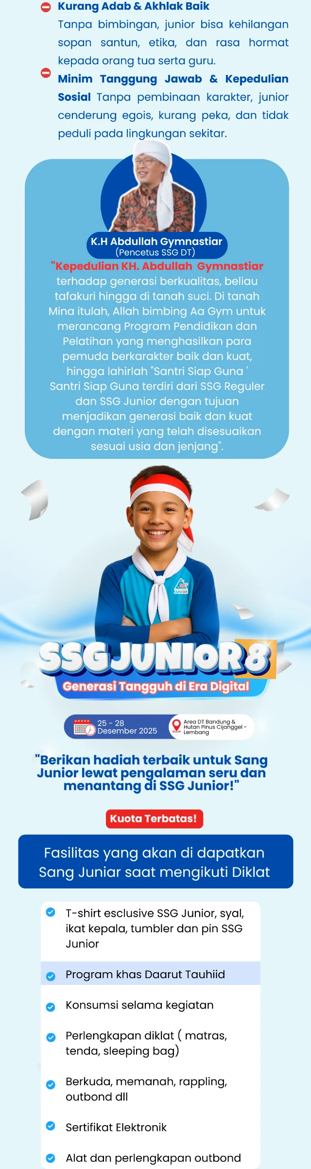 SSG Junior dirancang khusus untuk anak usia 9–13 tahun atau jenjang kelas 4 sd 6 , baik laki-laki maupun perempuan, yang ingin belajar jadi pribadi berani, disiplin, dan berakhlak juara.
