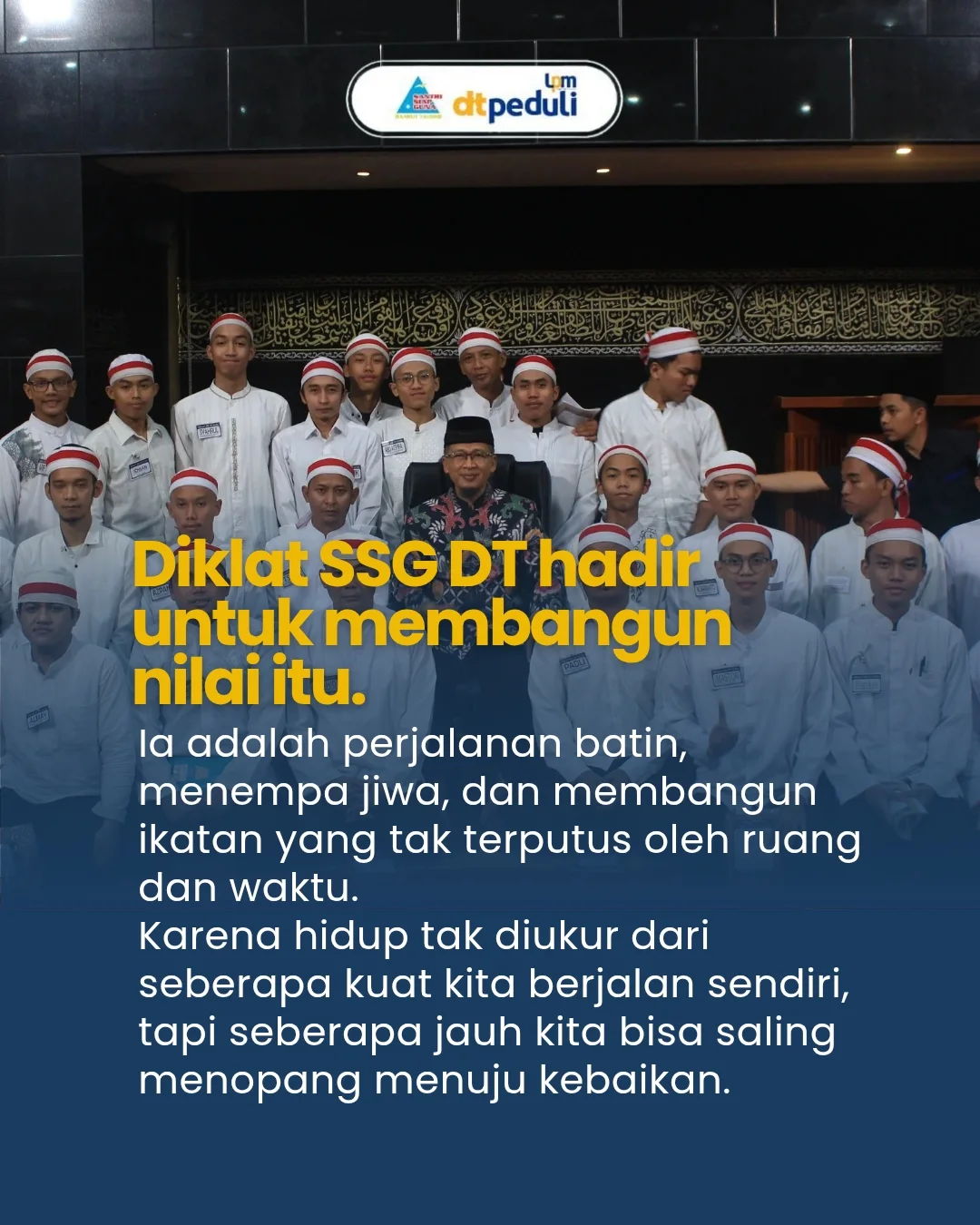 Diklat Santri Siap Guna (SSG) DT Reguler adalah program pendidikan dan pelatihan berbasis pesantren yang membekali peserta dengan keterampilan fisik, mental, spiritual, serta kepemimpinan untuk siap terjun dalam aksi kemanusiaan, dakwah, dan pengabdian masyarakat. Program ini berlangsung secara intensif dengan kurikulum terstruktur yang memadukan pembinaan karakter, pelatihan kedisiplinan, dan penguatan wawasan kebangsaan.